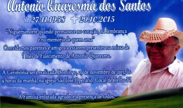 Família convida parentes e amigos para missa de 1 mês de falecimento do eterno vereador Quaresma do PT