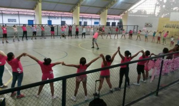 Dezenas de mulheres lotam as dependências do ginásio poliesportivo para participar de mais uma atividade do Outubro Mulher, projeto idealizado pela prefeitura da cidade.
