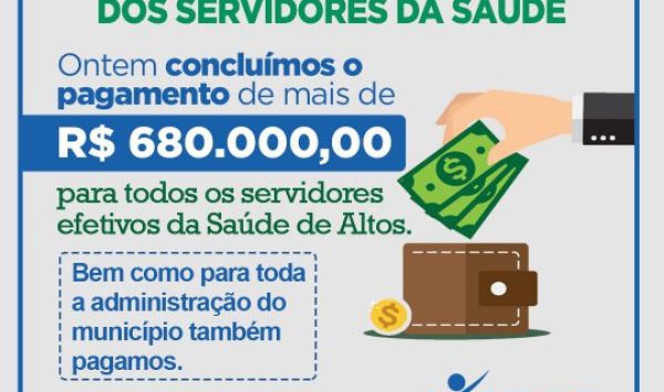 Os pagamentos foram realizados aos servidores efetivos da saúde, educação, assistência social, administração e demais secretarias dentro de 01 mes de gestão.