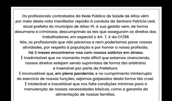 Vale lembrar que a situação na cidade de Altos/PI se encontra de forma calamitosa conforme as denúncias de moradores em relação as medidas de prevenção contra Covid-19 que afrouxaram durante