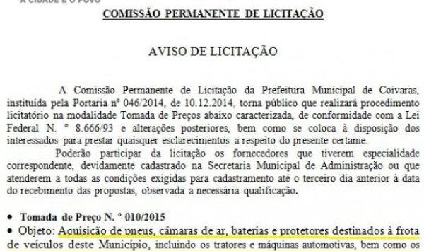 Aquisição de pneus, câmaras de ar, baterias e protetores destinados à frota de veículos