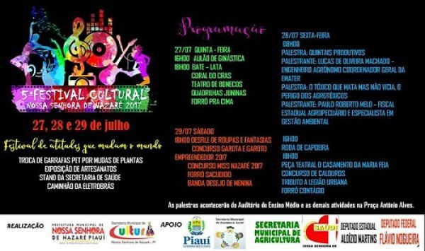 O 5ª Festival Cultural acontece entre os dias 27, 28 e 29 de Julho serão varias atrações e apresentações culturais