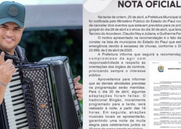Prefeitura anuncia cancelamento do show de Tarcísio do Acordeon em Buriti dos Montes após recomendação do MP