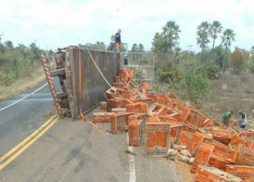Caminhão com carregamento de frango tomba na PI-114 entre Campo Maior e Cabeceiras do Piauí