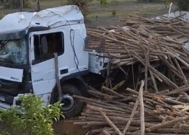 Caminhão com carregamento de madeira tomba na PI-114 entre Campo Maior e Cabeceiras do Piauí