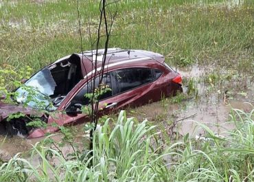 Carro sai da pista e fica parcialmente submerso às margens da BR-343 em Campo Maior (PI)
