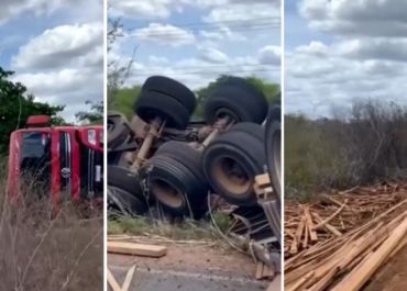 Caminhão carregado de madeira tomba na PI-115 entre Castelo do Piauí e S. M. do Tapuio
