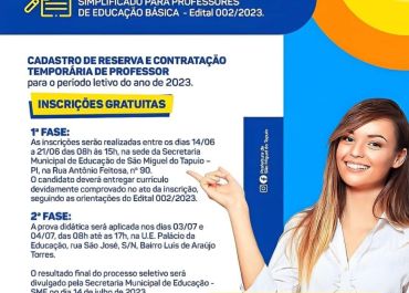 Prefeitura de São Miguel do Tapuio (PI) realizará seletivo para contratação de professores