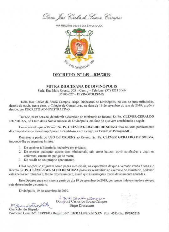 No decreto, o bispo classifica as sanções como “penas medicinais”, “na expectativa de que a verdade venha à tona e o revmo. sr. Padre Cléver Geraldo de Sousa possa ser readmitido ao exercício do ministério, podendo essas penas serem retiradas e, tão só expressamente, assim que as acusações forem devidamente apuradas”. (leia abaixo o decreto na íntegra)
