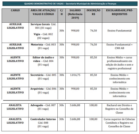 O concurso público oferece 09 vagas em cargos de níveis fundamental, médio/técnico e superior. Os salários variam de R$ 998,00 a R$ 3.686,88.