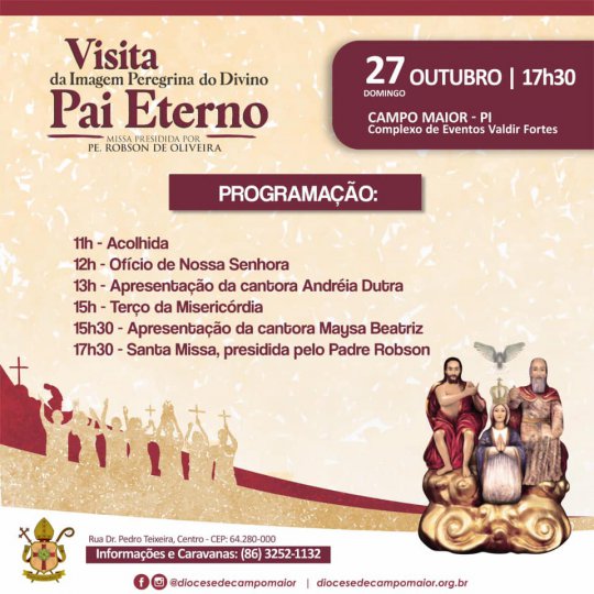 A Diocese de Campo Maior divulgou a programação, nesta quarta-feira(23), da visita da imagem peregrina do Divino Pai Eterno a Campo Maior nesse próximo domingo, dia 27 de outubro, na Praça Valdir Fortes. Será um dia todo repleto de louvor e oração.