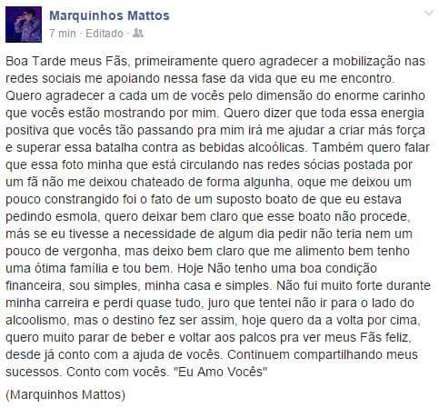 O cantor se manifestou atrav?s de um perfil criado na rede facebook depois da divulga??o da noticia. Segundo Marquinhos, n?o se chateou pelo fato de sua foto ter sido divulgada, mas a informa??o que estaria pedindo esmola. ?Se tivesse que pedir n?o teria problema, mas me alimento bem, tenho uma ?tima fam?lia e estou bem.