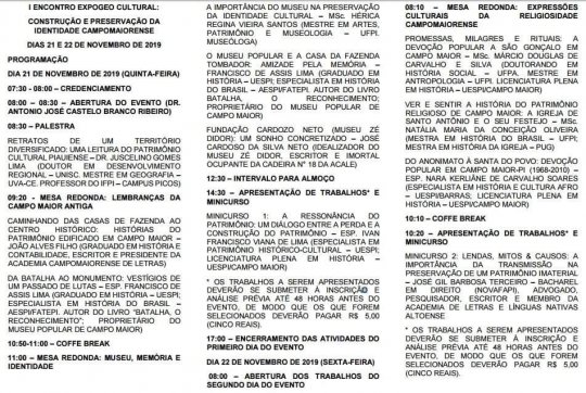 Por meio de mesas redondas, palestras, minicurso, apresentação de Trabalho, o Encontro visa promover discussões sobre a proteção do acervo cultural da cidade de Campo Maior.