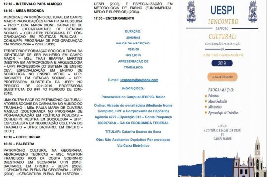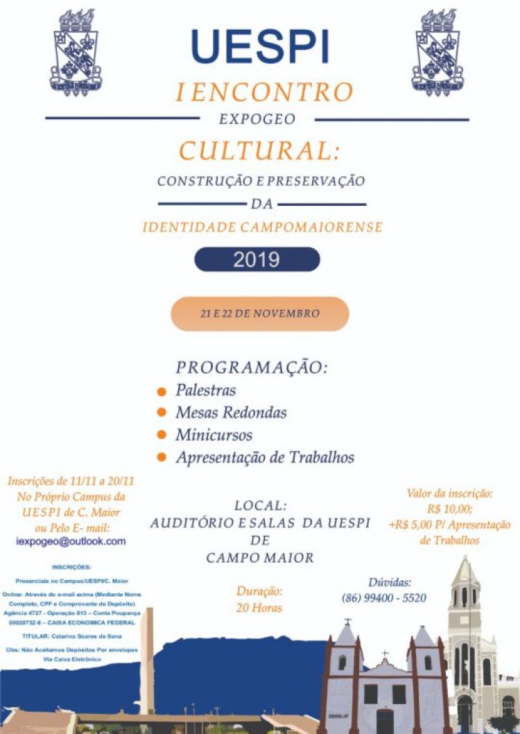 Com o objetivo de discutir o panorama do Patrimônio Cultural e a Identidade da Cidade de Campo Maior, a turma de Licenciatura plena em Geografia(UESPI), promoverá o I Encontro Cultural: Construção e Preservação da Identidade Campomaiorense, nos dias 21 e 22 de novembro, às 08:00 hora e com o termino às 17 horas, no Auditório da Universidade Estadual do Piauí, em Campo Maior.