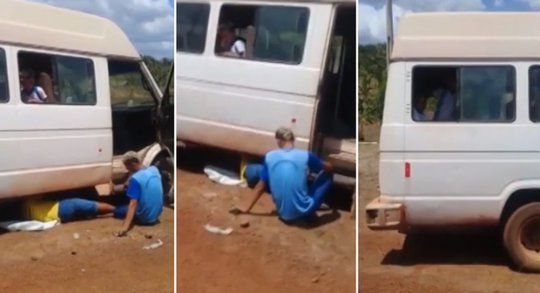 A imagem mostra o motorista, de camiseta amarela, deitado sob o veículo, enquanto um aluno, fardado, ajuda no conserto. É possível ver ainda alunos do lado de fora da van e outros dentro do veículo, aguardando o fim do reparo para concluir o trajeto. Ainda não se sabe se os alunos estavam indo ou voltando da escola.