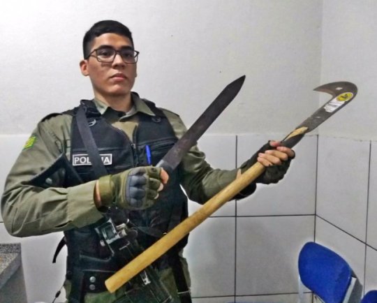 A Polícia Militar prendeu na tarde de ontem, segunda-feira (16/12) Francisco Ronaldo Faustino, de 21 anos. O mesmo estava de posse de um facão e de uma foice e ameaçava o dono de um bar no Bairro Santa Teresinha em Cocal, município da região norte do Piauí. Belarmino dos Santos Sobrinho, vulgo Belota, de 56 anos, relatou aos militares que o acusado chegou ao seu estabelecimento já embriagado e com uma foice e um facão em punho, onde passou a lhe ameaçar pelo fato do mesmo ter se recusado a lhe vender bebida alcoólica.