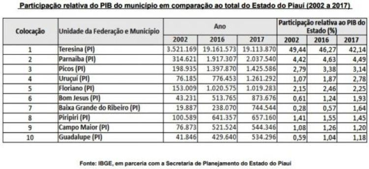 Somente Teresina concentrava 42,14% do PIB, seguido de Parnaíba com 4,49%, Picos com 3,14%, Uruçuí com 2,78%, Floriano com 2,25%, Bom Jesus com 1,93%, Baixa Grande do Ribeiro com 1,64%, Piripiri com 1,45%, Campo Maior com 1,20% e Guadalupe com 1,18%.