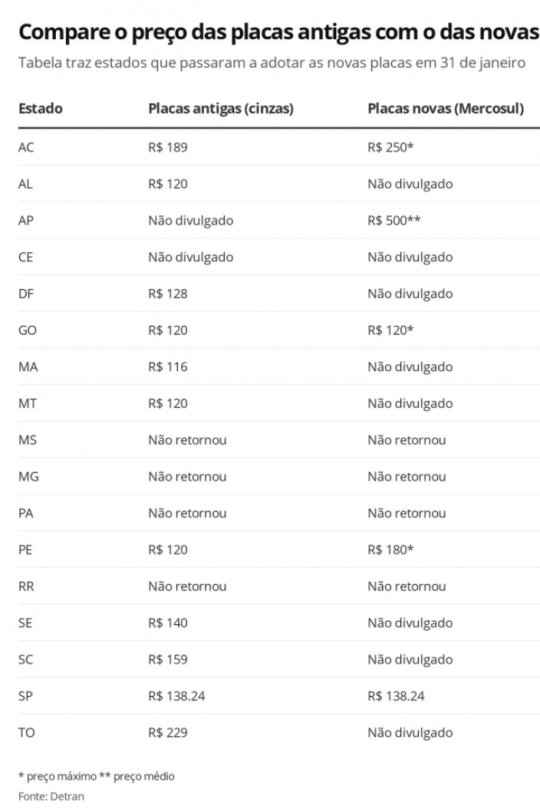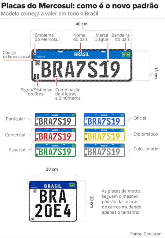 As novas placas do Mercosul entram em vigor em todo o Brasil nesta sexta-feira (31), depois de vários adiamentos. Elas se tornam obrigatórias apenas para carros novos e em situações que exijam a troca, como mudança de município e quando o item é danificado ou furtado.