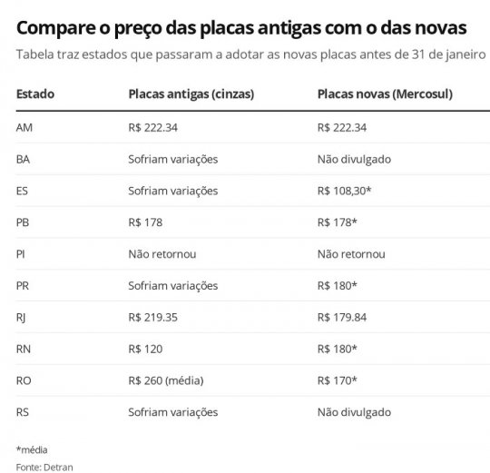 O Ministério da Infraestrutura disse que as novas placas devem ter custo semelhante ao das placas cinza. "Está próximo. Vai sair praticamente pelo preço da antiga. Mais para frente, até mais barato", afirmou o ministro Tarcísio de Freitas, no último dia 23.