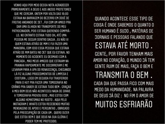 De acordo com publicações do próprio cantor, o acidente teria acontecido por volta das 16h após uma manobra mal executada no veículo. O cantor desmaiou após a colisão, foi socorrido, em seguida levado pata uma Unidade de Pronto Atendimento (UPA) e logo encaminhado para o Hospital de Urgência de Teresina (HUT) para os procedimentos médicos. A produção do cantor informou que ele sofreu um corte no nariz e na boca.