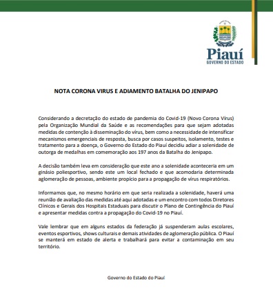 O Governo do Estado do Piauí nesta quinta-feira (12), decidiu adiar a solenidade de comemoração aos 197 anos da Batalha do Jenipapo. A decisão que veio por meio de uma nota emitida, leva em consideração que este ano a solenidade aconteceria em um ginásio poliesportivo, sendo este um local fechado e que acomodaria determinada aglomeração de pessoas, ambiente propício para a propagação de vírus respiratórios.