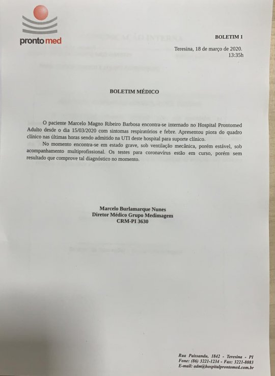 O boletim elaborado pelo Diretor Médico do Grupo Medimagem, Marcelo Burlamarque Nunes, informa que Marcelo Magno está sob ventilação mecânica, em estado grave, porém estável e passando por acompanhamento multiprofissional. Ainda segundo o boletim, os testes referentes a suspeita do coronavírus (Covid19) estão ainda em curso e até o momento sem resultados para uma possível infecção do vírus.