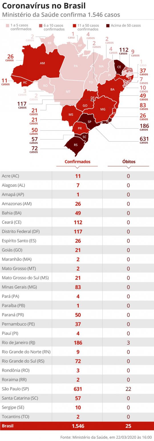 O Brasil tem 1.546 casos confirmados de novo coronavírus e 25 mortes até este domingo (22), diz o ministério da Saúde.