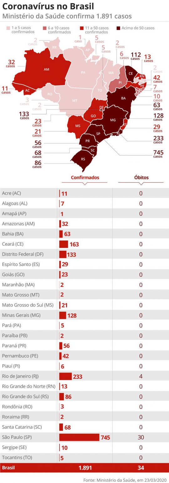 O total de casos confirmados de novo coronavírus (Sars-Cov-2) subiu para 1.891 nesta segunda-feira (23), segundo balanço do Ministério da Saúde. O número de mortes também aumentou para 34 mortes.