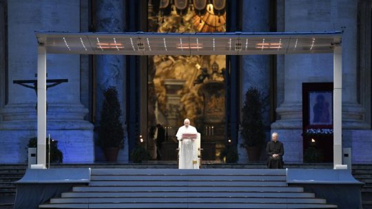 “Na nossa avidez de lucro, deixamo-nos absorver pelas coisas e transtornar pela pressa. Não nos detivemos perante os teus apelos, não despertamos face a guerras e injustiças planetárias, não ouvimos o grito dos pobres e do nosso planeta gravemente enfermo. Avançamos, destemidos, pensando que continuaríamos sempre saudáveis num mundo doente. Agora, sentindo-nos em mar agitado, imploramos-Te: «Acorda, Senhor!»”