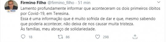 A exemplo do governo do Piauí, Wellington Dias, o prefeito de Teresina Firmino Filho também virou porta voz das notícias mais tristes sobre o coronavírus. O prefeito usou sua conta no Twitter para anunciar duas mortes pelo convid-19 na capital do Piauí neste domingo (29/03). Agora são três óbitos no Piauí. O primeiro foi o prefeito de São José do Divino, que morreu na madruga da sexta-feira no Hospital de Piracuruca, no norte do Piauí.