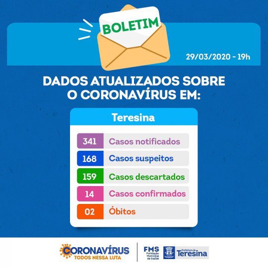 Em nota na noite deste domingo, a prefeitura de Teresina divulgou números atualizados até as 19hs deste domingo (29). São 314 casos notificados, 168 suspeitos, 159 descartados e 14 confirmados e 2 óbitos