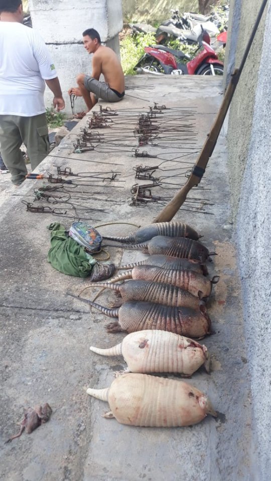 De acordo com as informações, os agentes avistaram rastro de motocicletas em direção ao Parque, que após andar em torno de 8km, um dos caçadores que retornava da caça foi abordado e preso por se encontrar com três tatus abatidos e dez espingardinhas de tatus. A equipe continuou no local até sair mais 02 caçadores, que também foram presos por estarem com 03 tatus e 28 espingardinhas de tatus.