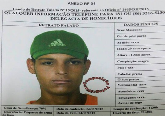 O grau de semelhança do retrato falado com o suspeito é de 70%. O acusado tem em média 20 anos, 1,58 metros de altura, cabelos pretos, cor parda e aspecto físico magro. Denúncias podem ser feitas através do telefone 181 ou 3216-5230.