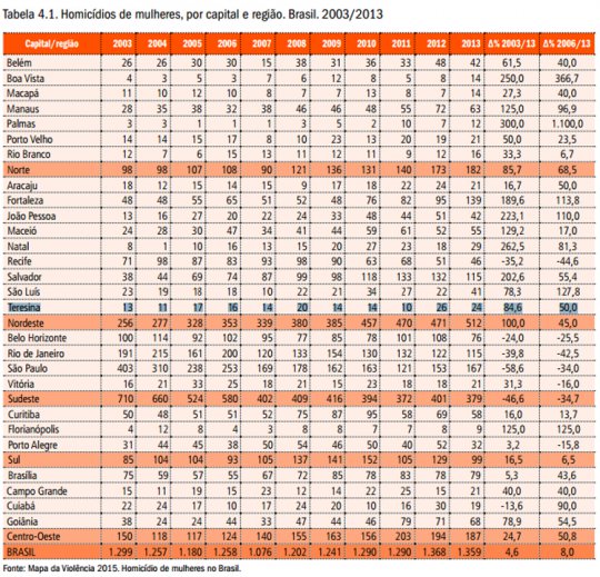 De acordo com a publicação, em Teresina foram registradas - no ano de 2013 - 5,5 homicídios para cada 100 mil mulheres. Com isso, Teresina ocupa a sexta menor posição dentre as capitais quanto ao percentual de mortes violentas. O aumento proporcional foi de 65,1%. O estado do Piauí teve 32 mortes em 2003 e em uma década o número saltou para 47 homicídios. O aumento em números absolutos foi de 46,9%.