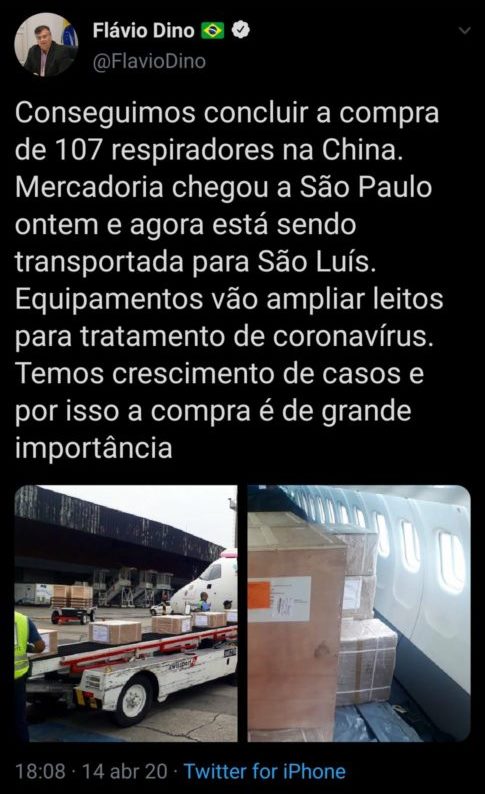 O estado Maranhão recebeu na última terça-feira (14/04) 107 respiradores e 200 mil máscaras vindas da China. Em matéria do jornal Folha de São Paulo, a negociação foi chamada de "operação de guerra", uma vez que há praticamente um mês é montado a logística do transporte da mercadoria. O custo do transporte foi de R$ 6 milhões, mas os respiradores tiveram custo zero ao estado.