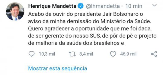 "Acabo de ouvir do presidente Jair Bolsonaro o aviso da minha demissão do Ministério da Saúde. Quero agradecer a oportunidade que me foi dada, de ser gerente do nosso SUS, de pôr de pé o projeto de melhoria da saúde dos brasileiros e de planejar o enfrentamento da pandemia do coronavírus, o grande desafio que o nosso sistema de saúde está por enfrentar", escreveu Mandetta.