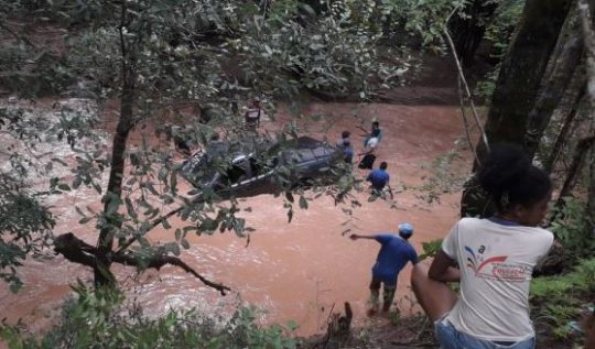 No momento havia três passageiros e os populares da comunidade passaram a ajudar o motorista a tirar o carro do dentro do Riacho.