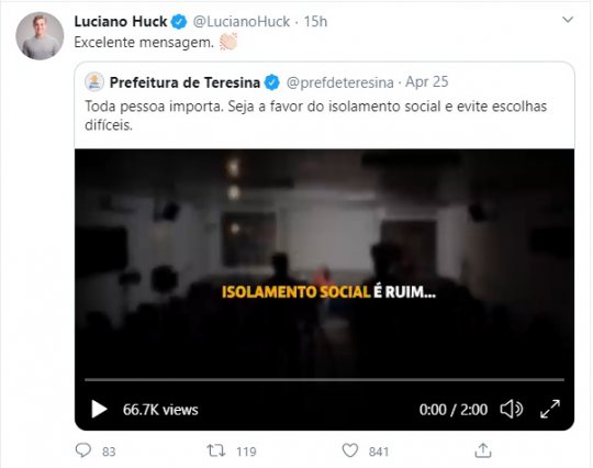 A repercussão do vídeo foi tão grande, que o apresentador Luciano Huck através de seu twitter compartilhou e parabenizou a campanha produzida pela Prefeitura de Teresina. Além do apresentador, o cantor Tico Santa Cruz também elogiou a campanha e compartilhou em suas redes sociais.