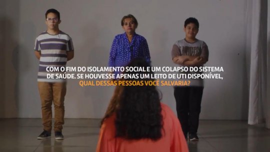 O vídeo mostra depoimentos de uma autônoma e de dois empresários que defendem a reabertura do comércio. Após opinarem contra o isolamento, o trio é questionado “Com o fim do isolamento social e um colapso do sistema de saúde, se houver apenas um leito de UTI disponível, qual dessas pessoas você salvaria?”. Em seguida, aparecem três pessoas da família dos empresários e eles dizem não poder escolher salvar apenas um ente querido.
