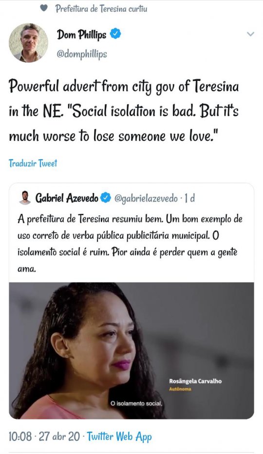 - Powerful advert from city gov of Teresina in the NE. "Social isolation id bad.But it's much worse to lose someone we love."- @domphillips.
