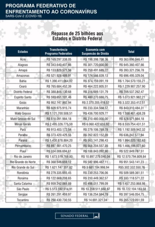 Pela proposta do senador, R$ 30 bilhões serão destinados a estados e R$ 20 bilhões a municípios. Os outros R$ 10 bilhões serão repassados diretamente para o enfrentamento ao coronavírus, nas áreas da saúde da assistência social.