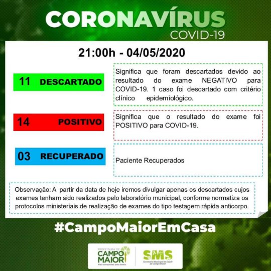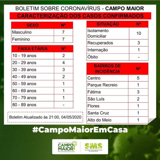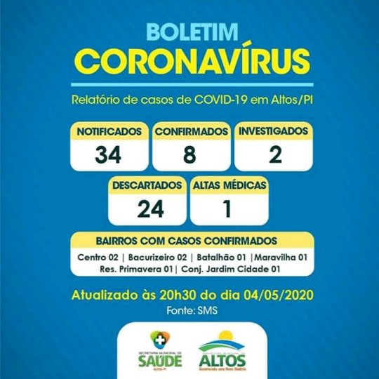 As secretarias municipais de saúde de Campo Maior e Altos, emitiram boletins informativos sobre o novo coronavírus no inicio da noite desta segunda-feira. Cada município atestou casos positivo para a covid-19, chegando a 14 em Campo Maior e 8 em Altos.