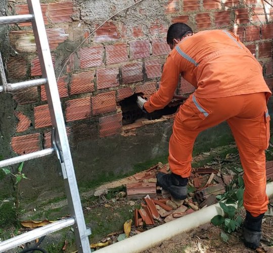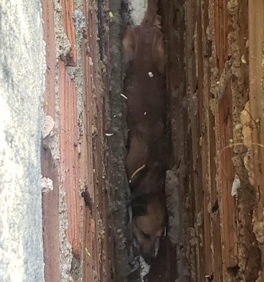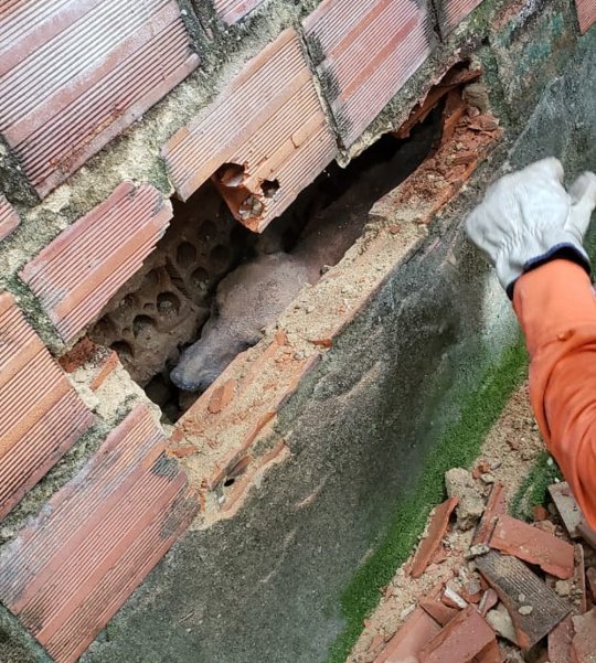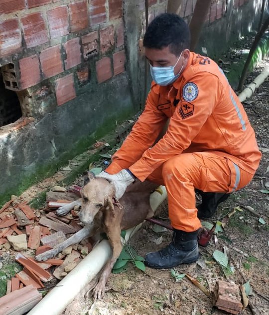 Um morador de uma das casas entre as quais o cão ficou preso foi quem acionou o Corpo de Bombeiros. O tenente Augusto César e o cabo Ramon foram os responsáveis pelo resgate e tiveram que quebrar uma parte de um dos muros para retirar o animal.