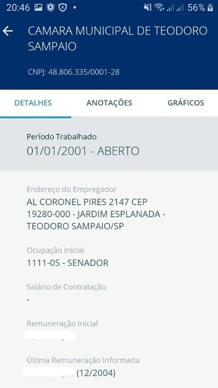 O outro registro que atrapalhou o acesso ao auxílio emergencial é o de dirigente do serviço público federal entre fevereiro de 2017 e janeiro de 2020. O contrato é junto à Prefeitura de Teodoro Sampaio.