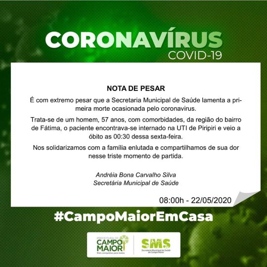 Na manhã desta sexta-feira (22), a Secretária de Saúde de Campo Maior divulgou por meio de uma nota, a primeira morte causada por Covid-19 no municipio.