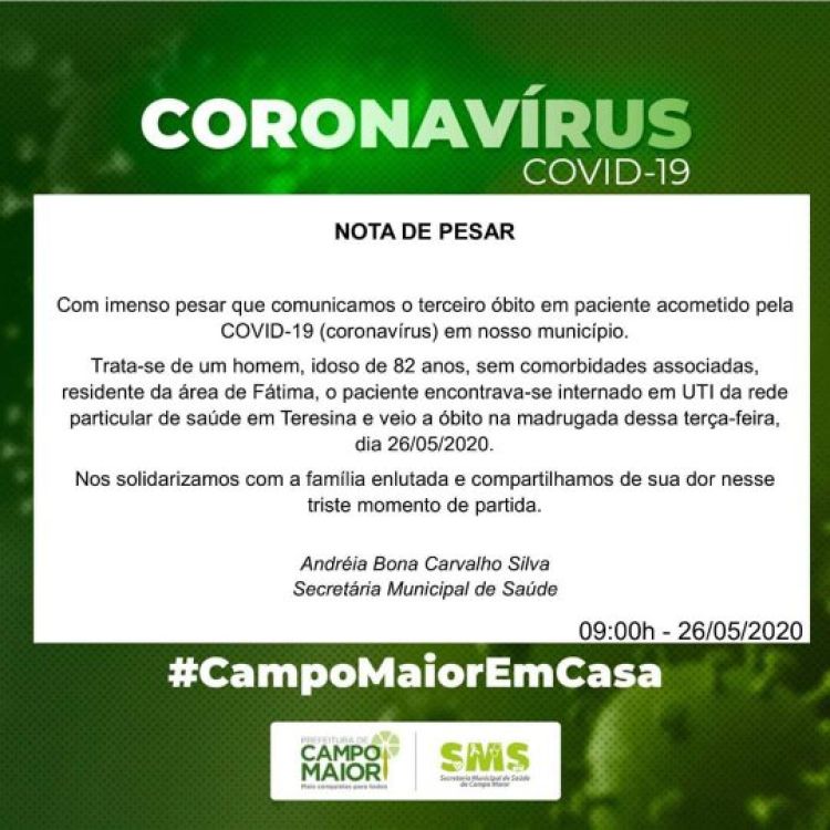 Na manhã desta terça-feira (26), a Secretária de Saúde de Campo Maior, divulgou uma nota lamentando a morte de um idoso de 82 anos, causada pela Covid-19.