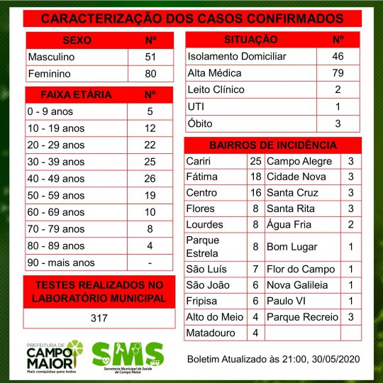 A secretaria municipal de Saúde de Campo Maior divulgou boletim atualizado na noite deste domingo com 8 novos casos confirmados em relação ao boletim de ontem. Agora são 139 casos confirmados da covid-19 no município.