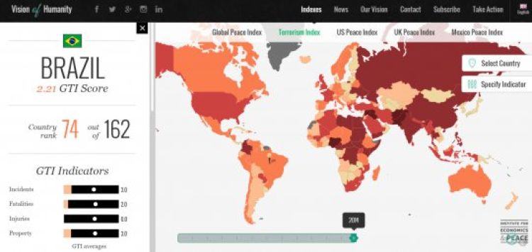 O Brasil é o 74º país do mundo com maior incidência de casos de terrorismo, segundo o Índice de Terrorismo Global, um levantamento de atentados realizados ao longo de 2014 em todo o mundo.