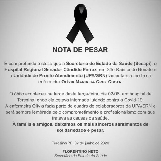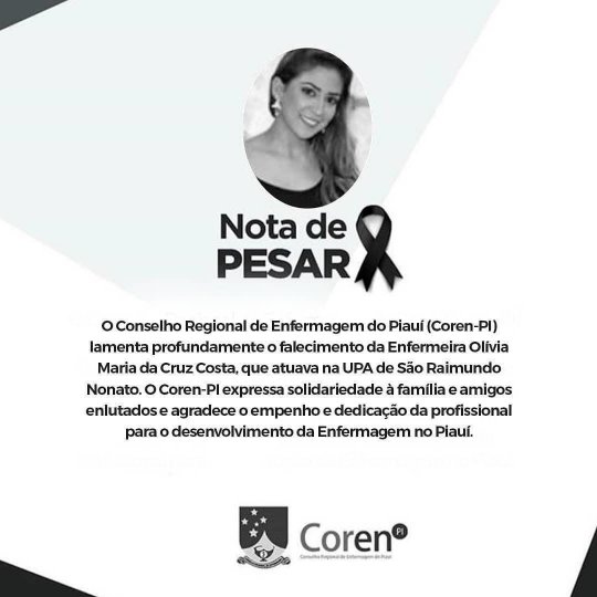 A enfermeira Olívia Maria da Cruz Costa, de 32 anos, morreu durante tratamento de coronavírus na tarde desta terça-feira (02/06), em Teresina. Ela atuava no Hospital Regional Senador Cândido Ferraz e na Unidade de Pronto Atendimento de São Raimundo Nonato, na região Sul do Piauí, e não possuía comorbidades.