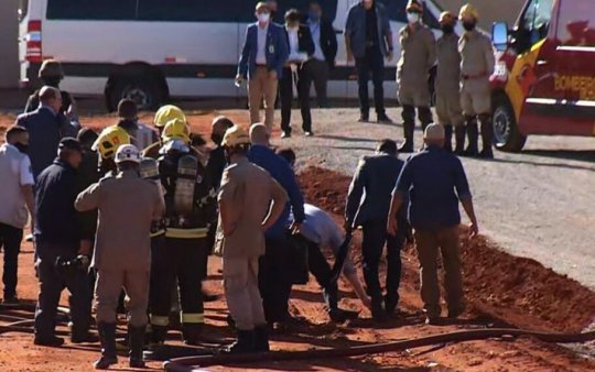 O presidente Jair Bolsonaro (sem partido) participou da inauguração do Hospital de Campanha de Águas Lindas de Goiás, no Entorno do Distrito Federal, nesta sexta-feira (5). Ele não usava máscara e, ao se dirigir ao local da cerimônia, escorregou e caiu.